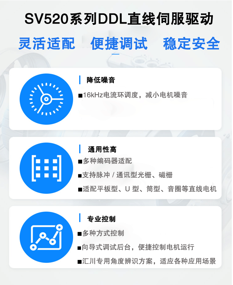 ■ 穩(wěn)定適配各平板型、U 型、筒型、音圈等直線電機