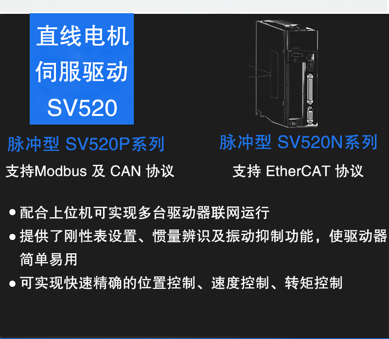 SV520系列伺服驅動器產品是匯川技術研制的可驅動直線電機的驅動裝置,脈沖型SV520P系列支持MODbus及CAN協(xié)議,網絡型SV520N系列支持EtherCAT協(xié)議,配合上位機可實現多臺驅動器聯(lián)網運行。提供了剛性表設置、慣量辨識及振動抑制功能,使驅動器簡單易用,可實現快速精確的位置控制、速度控制、轉矩控制。
