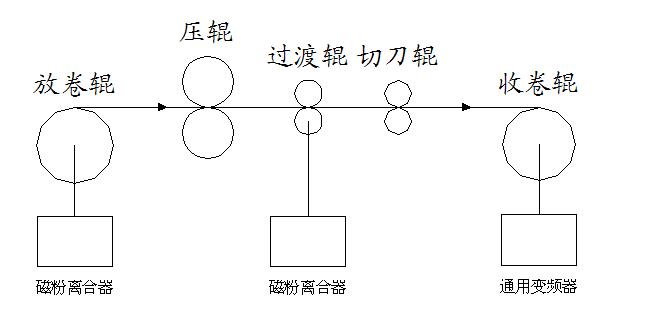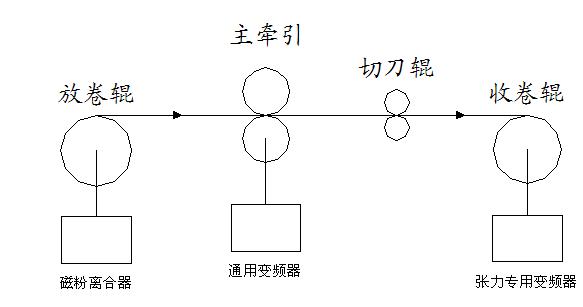 設備在改造前的現(xiàn)狀如下圖所示,鋁板(該公司的分條機主要用于鋁板分條)從放卷輥出來后在經(jīng)過切刀輥處縱切成若干條鋁條后收卷到收卷輥上。其收放卷分別采用磁粉離合器控制和通用變頻器控制,壓輥起張力隔斷作用,收放卷的張力分別由壓輥前后的磁粉控制。收卷變頻器工作在速度控制模式下,這樣,在不調(diào)節(jié)收卷電機速度的情況下,隨著收卷卷徑的逐漸變大,整機的線速度會越來越快,而磁粉離合器在高速場合下張力控制不穩(wěn),分條出來的鋁條幅寬誤差范圍較大(50個絲),端面粗糙不平,甚至出現(xiàn)鋁條跑偏現(xiàn)象,所以在分條過程中需要人為的進行減速。這樣,不僅設備無法實現(xiàn)高速分條,而且對操作工的要求較高,不同的操作工生產(chǎn)出來的產(chǎn)品質(zhì)量不一樣,生手的操作工做出來的產(chǎn)品合格率較低。這對廠家來說不僅生產(chǎn)效率低,而且還造成了資源浪費。改造前,該設備已經(jīng)無法正常生產(chǎn)。