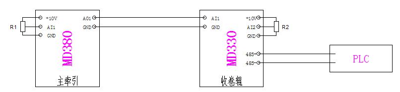 2、收卷輥使用匯川張力專用變頻器MD330驅(qū)動,工作在張力開環(huán)轉(zhuǎn)矩控制模式下,該工作模式下,電機需安裝編碼器。MD330是一種可以實現(xiàn)恒張力控制的變頻器,變頻器通過接收來自主牽引MD380變頻器AO1端口輸出的線速度信號后進行內(nèi)部的計算,可以獲得料卷的實時卷徑,通過算出的卷徑控制變頻器的輸出力矩來獲得恒張力控制。系統(tǒng)的收卷張力通過電位器R2來調(diào)節(jié);