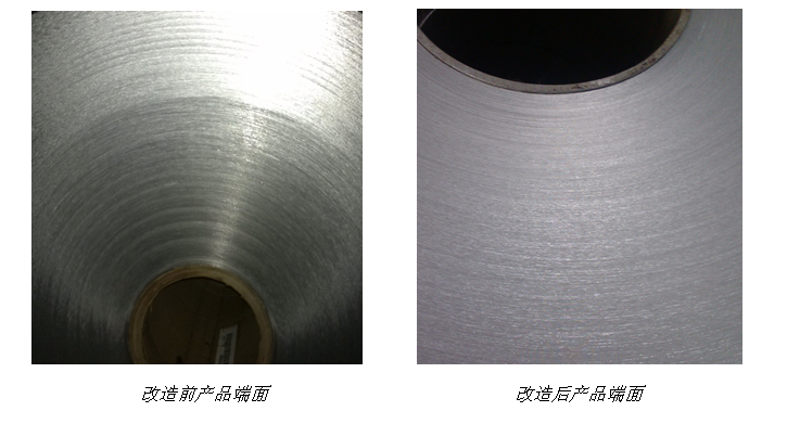 據(jù)回訪,該設備工作正常,因工藝要求,目前生產(chǎn)速度為60m/min(最高可達80m/min),速度較改造前提高了50%,且分條幅寬誤差在20個絲以內(nèi),整體端面平整。