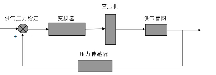 根據(jù)用戶需要,先設(shè)定“給定壓力值”,系統(tǒng)運(yùn)行后則壓力變送器檢測管網(wǎng)的“實(shí)際壓力值”送往變頻器,變頻器經(jīng)過PID運(yùn)算控制變頻器的輸出電壓及頻率,當(dāng)用氣量增加,輸出頻率升高,電機(jī)轉(zhuǎn)數(shù)升高,供氣量增加;當(dāng)用氣量減少時(shí),電機(jī)轉(zhuǎn)速降低,供氣量減少,從而使管網(wǎng)供氣壓力恒定。控制原理圖如下所示: