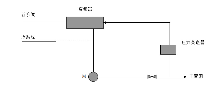 為了滿足生產(chǎn)要求,本著節(jié)約及盡量不改動(dòng)原有設(shè)備的目的,以及生產(chǎn)的需要。我們對(duì)132KW空壓機(jī)進(jìn)行變頻控制。根據(jù)供氣要求,變頻與工頻有電氣聯(lián)鎖,為使系統(tǒng)安全可靠,變頻裝置與原系統(tǒng)有聯(lián)鎖及切換功能。新系統(tǒng)具有過流、過壓、欠壓、過載等保護(hù)功能。下圖為系統(tǒng)構(gòu)成圖,該系統(tǒng)由一臺(tái)空壓機(jī),一臺(tái)變頻器,一只壓力變送器。通過變頻電控柜上的面板可顯示運(yùn)行參數(shù)和故障報(bào)警等。