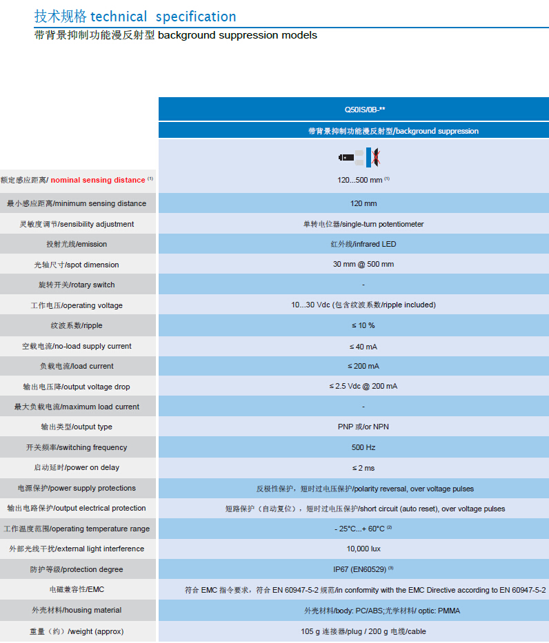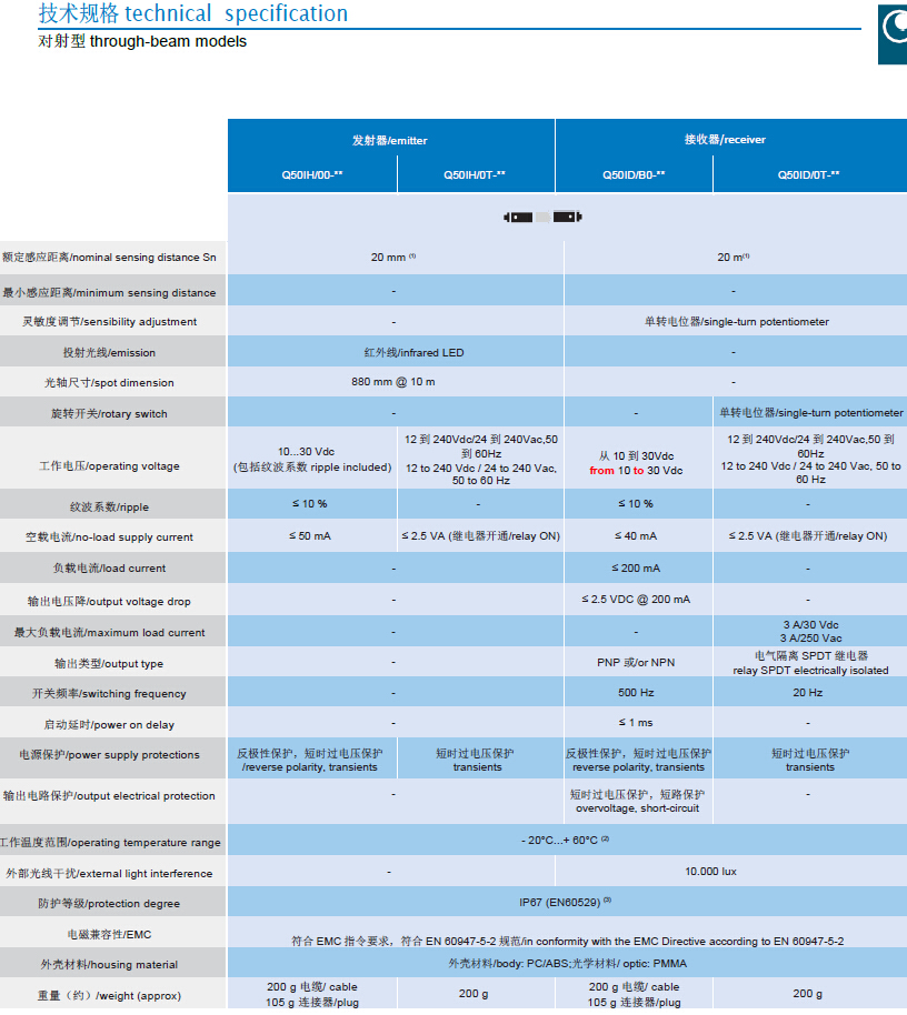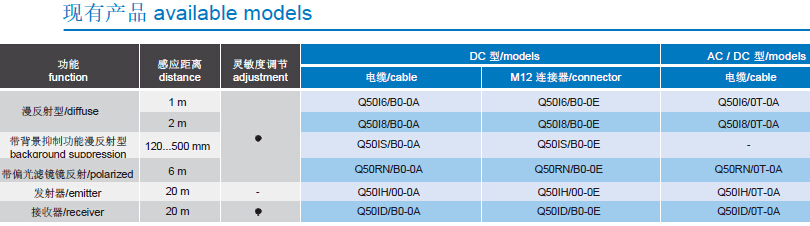 • 光學(xué)功能產(chǎn)品選擇廣泛:漫反射型:2m;帶背景抑制功能漫反射型:500mm;帶偏光濾鏡型鏡反射型:6m;對射型:20m。雙區(qū)多功能輸出狀態(tài) LED.