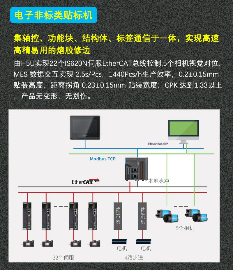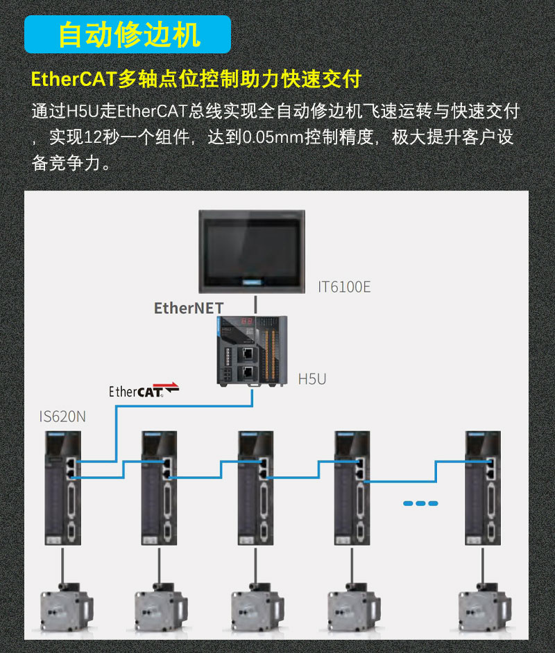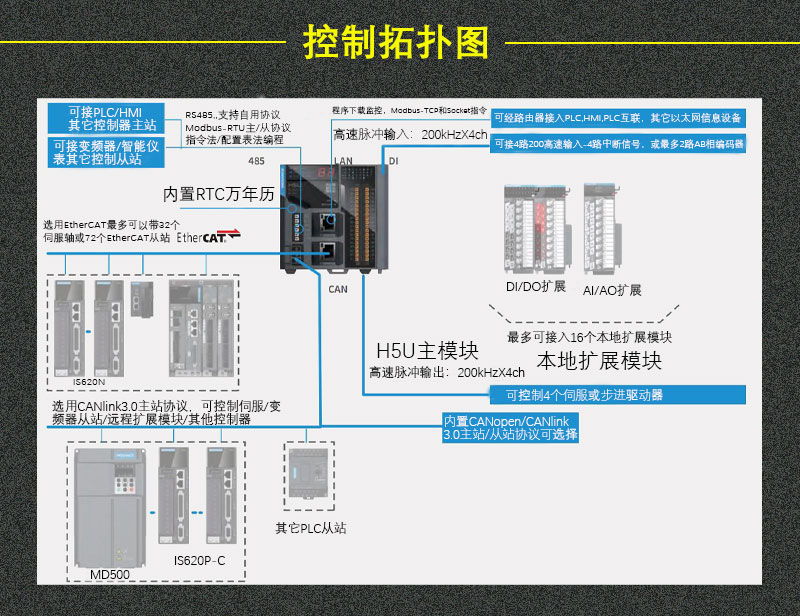 ● H5U系列EtherCAT總線高性能小型PLC,特別適合于多軸點位控制,與視覺、機器人、掃碼槍、MES等有信息交互的場合。