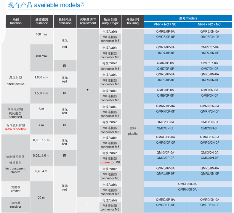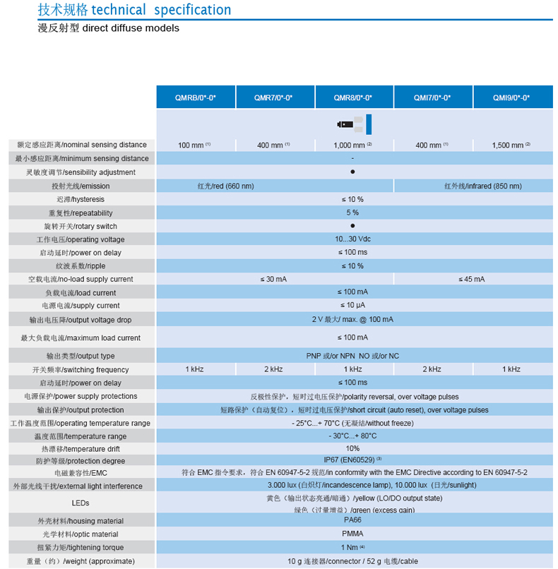 • 產(chǎn)品范圍廣泛:短距離,中等距離和長感應(yīng)距離的漫反射型,檢測透明物體的鏡反射型,