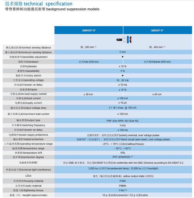 • 開關(guān)頻率 2 kHz ,帶機械調(diào)整的背景抑制功能漫反射型