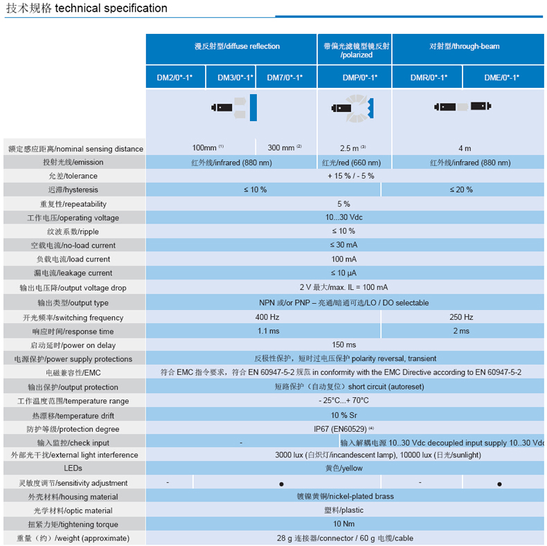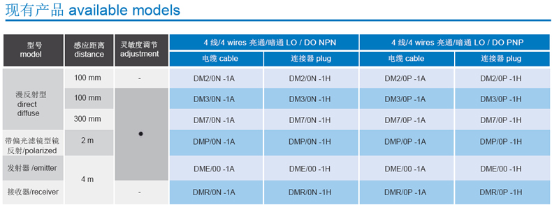 • 漫反射型、帶偏光濾鏡型鏡反射型、對射型產(chǎn)品 Models diffuse reflection, polarized and through-beam