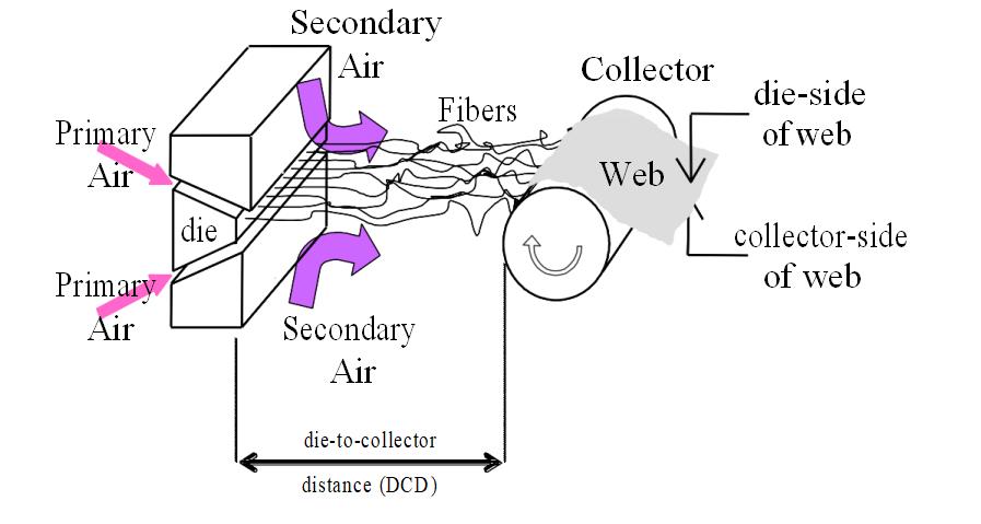 熔噴法也是聚合物直接成網(wǎng)法中的一種,它是將螺桿擠出機擠出的高聚物熔體通過用高速高溫氣流噴吹或其它手段使熔體細流受到極度的拉伸而形成極細的纖維,然后聚集到成網(wǎng)滾筒或成網(wǎng)簾上形成纖網(wǎng),最后經(jīng)自粘合作用得以加固而制成熔噴法纖維非織造布。