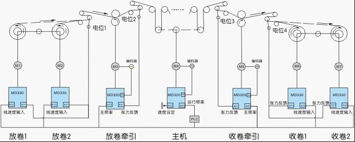 系統(tǒng)由七臺(tái)電機(jī)進(jìn)行變頻傳動(dòng)控制,分別為兩臺(tái)放卷(MD330)、兩臺(tái)收卷(MD330)、主機(jī)(MD320)一臺(tái)和收、放卷牽引(MD320)各一臺(tái)構(gòu)成,其中收卷、放卷、收放卷牽引都是帶張力反饋的閉環(huán)張力控制,變頻器工作在速度模式;由于兩級(jí)牽引中間是印刷單元,對(duì)套色精度有很高的要求,因而對(duì)張力調(diào)節(jié)的穩(wěn)定性要求很高,所以主機(jī)和兩級(jí)牽引采用帶編碼器的閉環(huán)矢量控制,如圖所示: