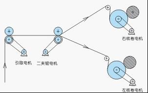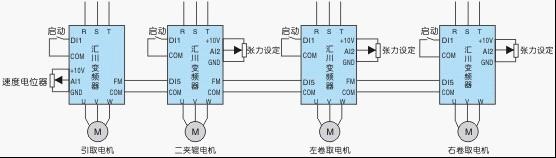 吹膜機(jī)摩擦收卷系統(tǒng)控制方案說明: ■ 采用速度差方式進(jìn)行張力控制; ■ 利用高速脈沖口保證引取、二夾輥、收卷輥之間的基本同步比例關(guān)系,隨后用張力電位器給定一個疊加速度,使其與系統(tǒng)速度產(chǎn)生速度差形成張力;