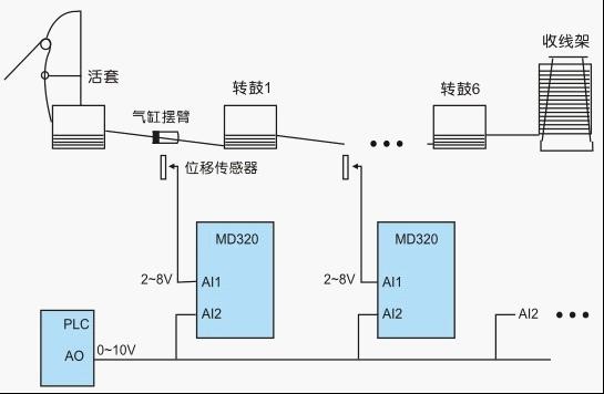 其工作原理是:根據(jù)操作工在面板設(shè)定決定作業(yè)的速度,該速度的模擬信號進入PLC,PLC考慮加減速度的時間之后按照一定的斜率輸出該模擬信號。這樣做的 目的主要是滿足點動、穿絲等一些作業(yè)的需要。PLC輸出的模擬電壓信號同時接到所有變頻器的AI2(AI1也可以)輸入端,作為速度的主給定信號。各擺臂 位移傳感器的信號接入到對應(yīng)的轉(zhuǎn)鼓驅(qū)動變頻器作為PID控制的反饋信號。根據(jù)擺臂在中間的位置,自己設(shè)定一個PID的給定值。這個系統(tǒng)是非常典型的帶前饋 的PID控制系統(tǒng),一級串一級,PID作為微調(diào)量。