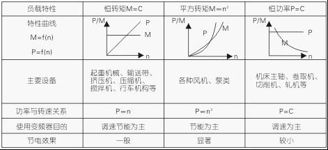 生產(chǎn)機(jī)械是各式各樣,種類繁多的,但負(fù)載類型主要有三類,它們與節(jié)能的關(guān)系見表1。表中的P(KW)、M(nm)、n(r/min)。